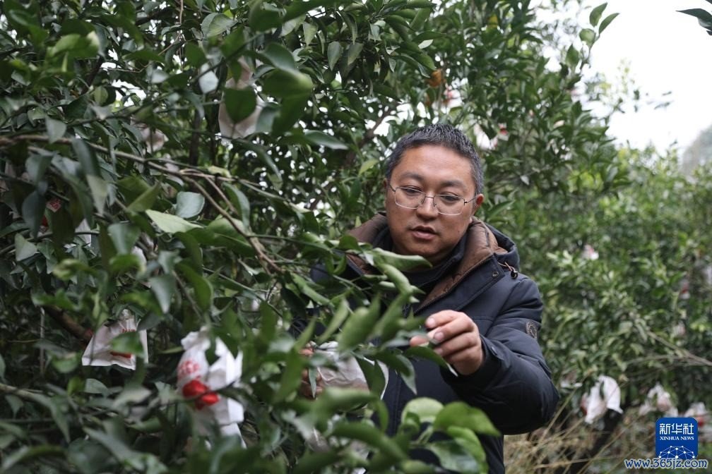 r2024年12月19日,蒲江县铁牛村村民何孝成在柑橘林内检察柑橘长势。新华社记者杨进摄