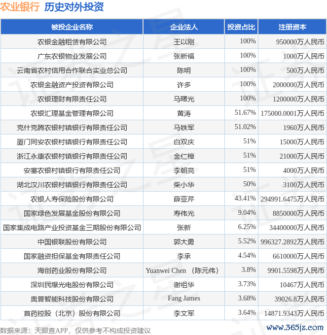 本站音问,凭证天眼查APP清晰,农业银行(601288.SH)新增沿途对外投资事件,被投资公司为广州广哈通讯股份有限公司开云体育,法定代表东谈主孙业全,投资占比为0.23%。该公司从事仪器姿色制造业,注册成本为24917.0606万东谈主民币。现在,农业银行共存在对外投资604项,投资占比前20的形貌见下表: