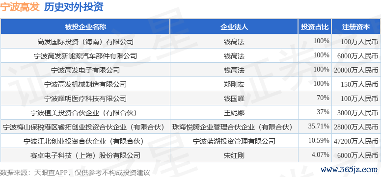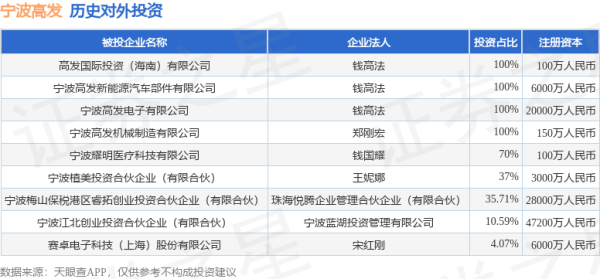 本站音问,字据天眼查APP败露,宁波高发(603788.SH)新增通盘对外投资事件,被投资公司为高发海外投资(海南)有限公司,法定代表东说念主钱高法,投资占比为100%。该公司从事汽车制造业,注册老本为100万东说念主民币。当今,宁波高发共存在对外投资9项,详见下表:
