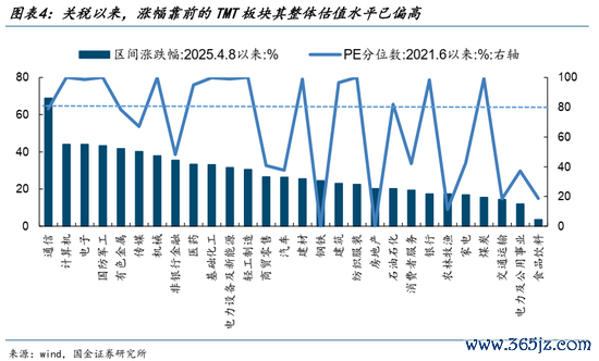 在市集快速上行中, TMT+军工照旧险些完成了“销亡低估值”,尽管市集行业轮动速率加速,握住但愿在最具“赢利效应”的赛说念中寻找到低位标的,但空间是有限的。关税以来,TMT+军工板块涨幅靠前,行业层面的全体估值当下已达到历史较高水平,里面个股估值中位数也到达历史高位,且个股之间估值分位数的各异握住裁减,办法出市集在“中枢高景气”赛说念中寻找低位股的勤勉。从上周启动,成长里面执续呈现从国证2000为代表的小盘成长向以创业板指为代表的大盘成长切换的特征,行业上也出现“高切低”特征,办法为行业轮动速率加速。面前A股分化下,成长赛说念里面中可切换的标的可能在于医药以及创业板指,它们的估值中位数相对偏低,同期个股估值各异较大,更容易找到低位股。