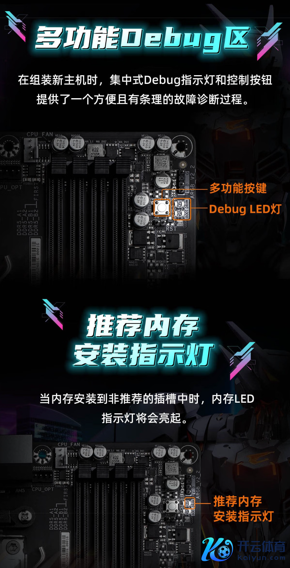 新款技嘉 B850M 电竞雕主板还对主板 Debug 区域进行重新贪图,聚合式辅导灯与截至按钮,能帮玩家快速定位故障,装机愈加驾轻就熟。内存装配辅导灯也更显贴心,错差有亮灯指示,让小白用户更快上手。