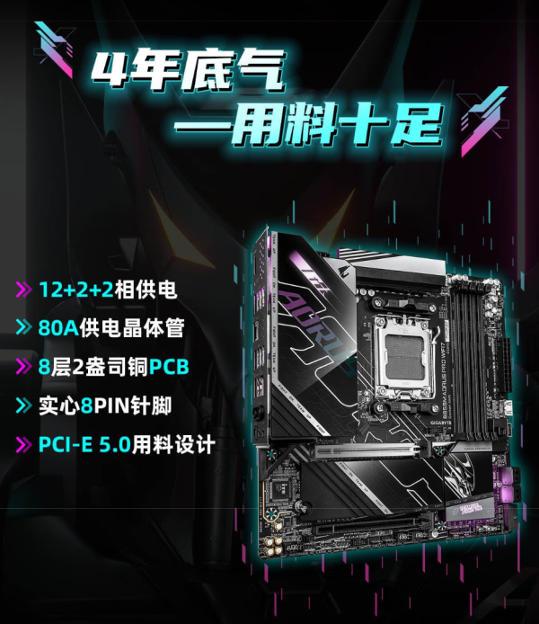 最初给环球保举一块 AMD 平台的主板,技嘉 B850M 电竞雕。它用料塌实,配备 12+2+2 相强化供电,搭配 80A 大电流晶体管,还有 8 层 2 盎司铜 PCB 和实心 PIN 针脚的加握,搭配锐龙 9000 系列旗舰处罚器也不在话下。
