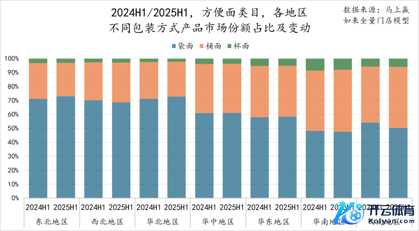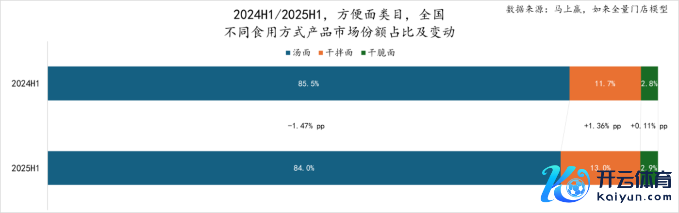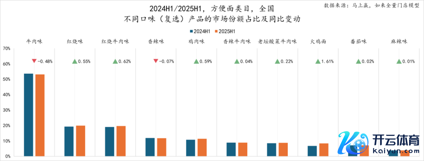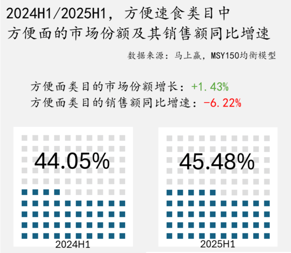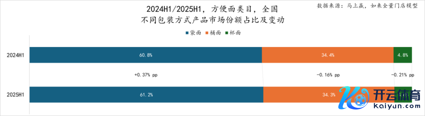当作浅显速食类目中的第一大类目,浅显面在浅显速食类目中的阛阓份额占比在两个时候段均在45%傍边,占据了快要半壁山河。2025年上半年(下称2025H1)同比2024年上半年(下称2024H1),浅显面在浅显速食中的阛阓份额普及了1.43%,蹙迫性进一步普及。