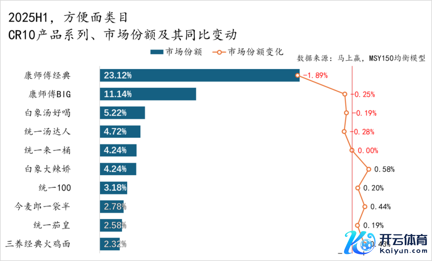 从浅显面类看法产物系列样子上看,CR10产物系列被CR5的集团包揽。康师父的经典系列+BIG系列,占据了第一&二名遐想约34%的阛阓份额,但其阛阓份额均呈现同比下滑,其中康师父经典系列阛阓份额同比下滑达1.89%,跌幅较为显赫;白象汤好喝、调和汤达东谈主、调和来一桶、白象大辣娇四个产物系列的阛阓份额均在5%傍边,仅有白象大辣椒阛阓份额同比增长,或也可从侧面看出调和、白象的贴身竞争相配浓烈;再往后看第6-10名,阛阓份额均位于2%~3%傍边,其中调和占据了两席,另外两席则由今麦郎一袋半,三养经典火鸡面系列分别占据,四个系列的阛阓份额同比均为正,且增长幅度比拟自己阛阓份额均较大。