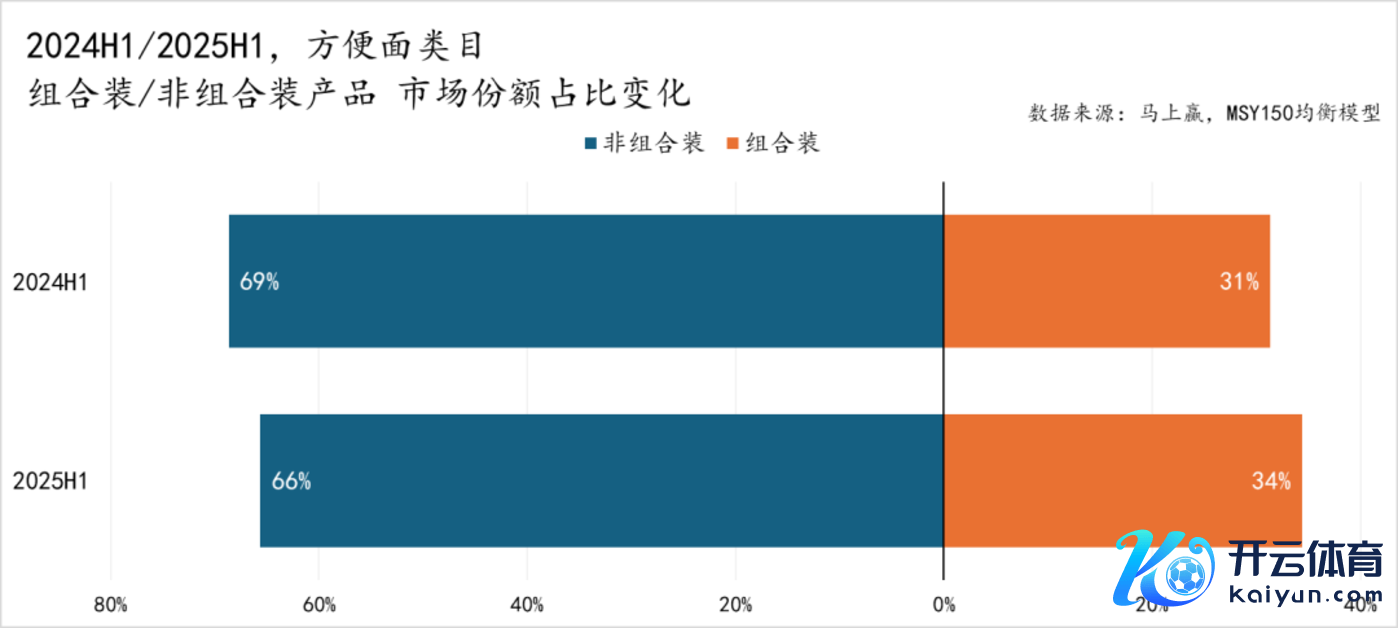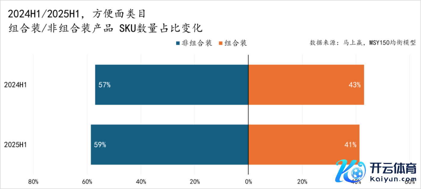 从有售SKU数目的占比上来看,与阛阓份额的占比则呈现着交流的景色与不同的趋势。景色上,非组合装:组合装一样为6:4傍边的比例,与阛阓份额占比一致。不同的则是趋势,2025H1同比2024H1,非组合装有着2%的占比上升,对应组合装则有着2%的下落,推断可能与浅显面类看法推崇优于浅显速食及食物大类合座,品牌及厂商出新意愿较强相关。一般来说,品牌推新的旅途王人是从非组合装的老例规格包装启动,一个产物在老例规格中取得了一定的正向反应,才会进一步在组合装,以及多规格上进行拓展。