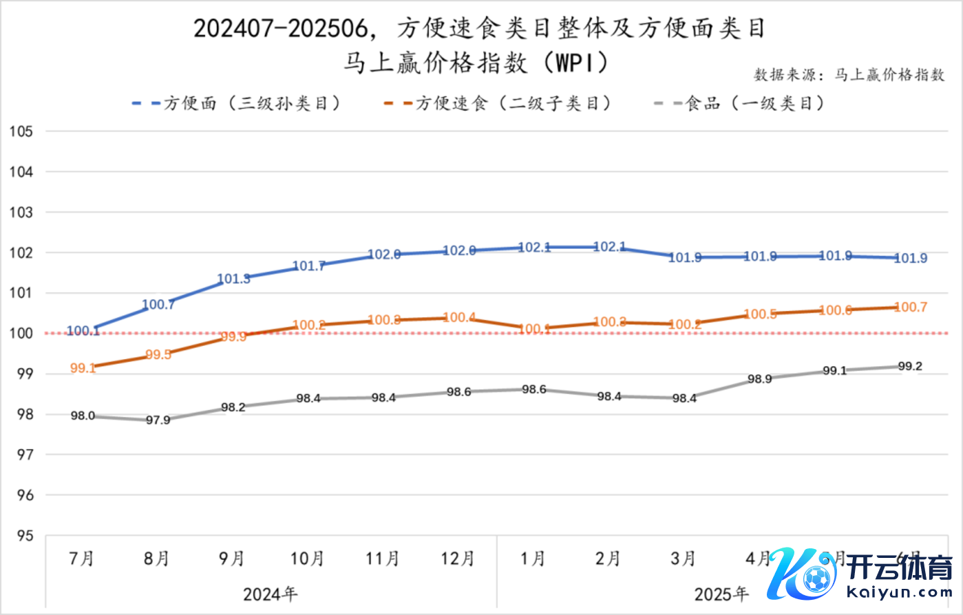 为了分析浅显面的价钱水平变化,咱们拉取了202407-202506,浅显面类看法马上赢价钱指数(WPI),并同步拉取了浅显面的上司类目浅显速食、以及浅显速食的上司类目食物的马上赢价钱指数当作参考。马上赢价钱指数以 100 为基准值,数值波动代表该类目价钱指数与旧年同时的相对百分比:100 暗意与旧年同月捏平,高于 100 意味着同比价钱水平上升,低于 100 则暗意同比价钱水平下落。
