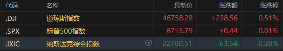竣事收盘,说念琼斯指数涨0.51%,报46758.28点;标普500指数涨0.01%,报6715.79点,双双刷新了前一天录得的收盘记录;纳斯达克详尽指数跌0.28%,报22780.51点。